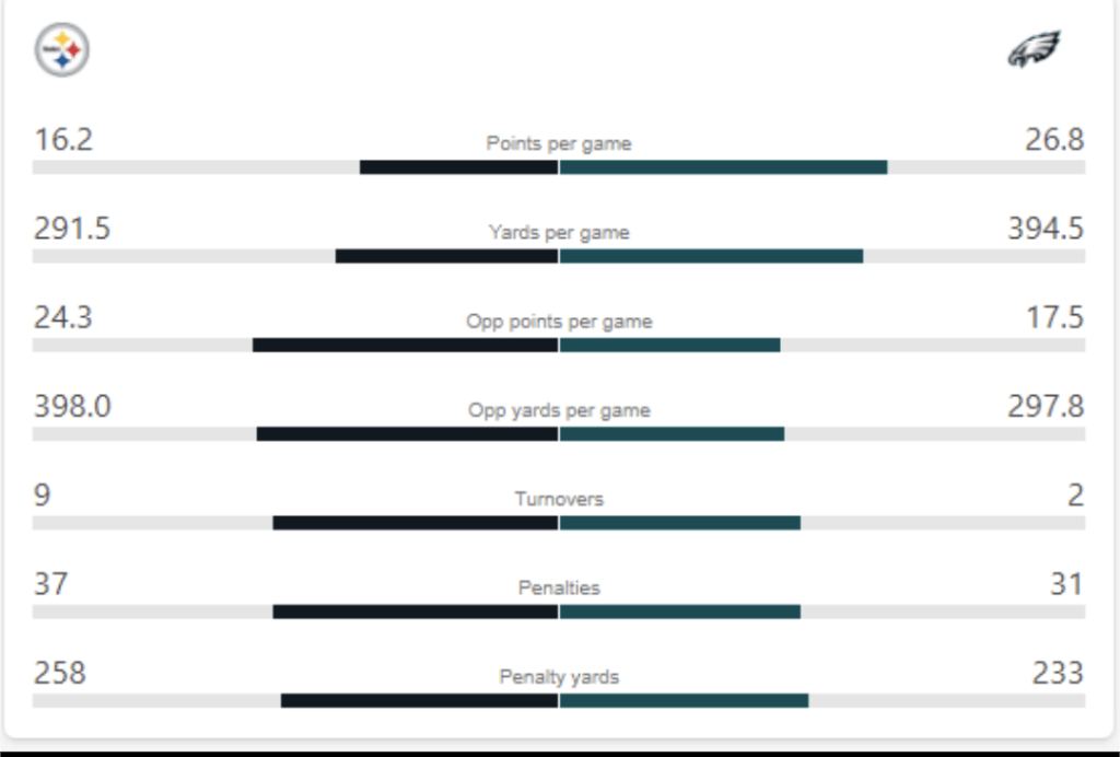 On paper, this should be no contest. The Steelers have struggled for most of the season so far as they try to find an identity. Running back Najee Harris is a load to bring down, and he can do it all out of the back field, but he has gotten off to a slow start this season. After that, the Steelers offense features Dionte Johnson and rookie George Pickens running routes against Darius Slay and James Bradbury. That’s an edge for the Eagles.