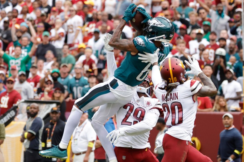 The second-year Eagles wide receiver’s accomplishment is noteworthy because it is now the team record for most receptions. This accolade is a bit unexpected if you remember how Smith’s season started out against the Lions in Detroit. Smith recorded zero catches on only four targets in the Eagles’ Week 1 38-35 shootout victory. After that, Smith was incredibly productive for Jalen Hurts and as A.J. Brown’s running mate.