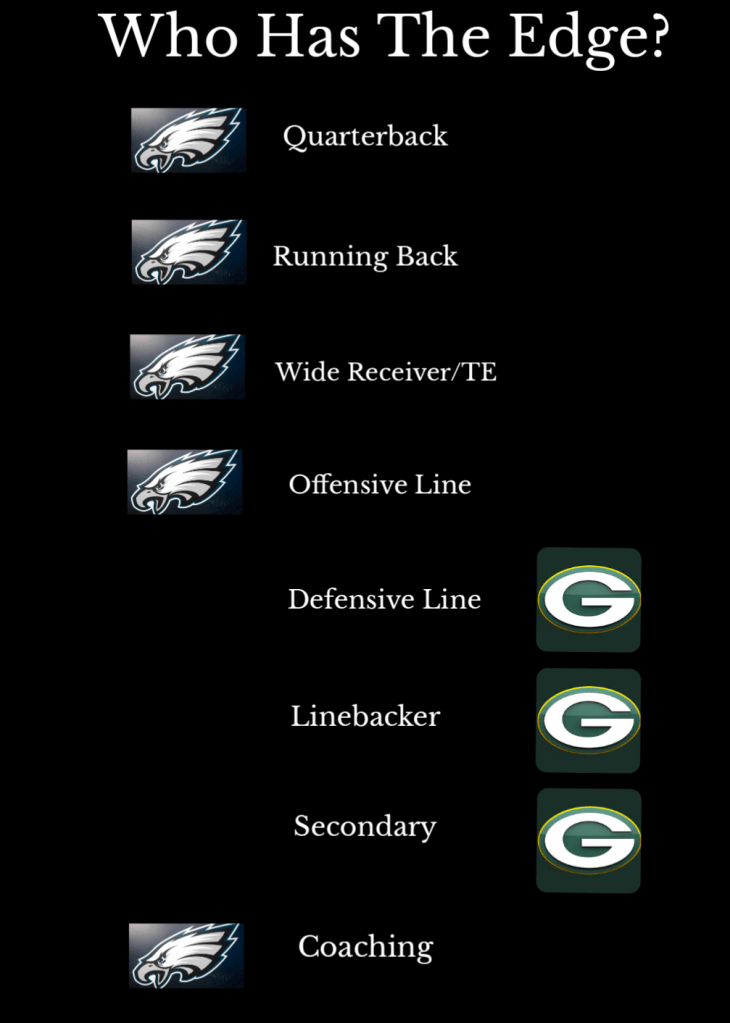 We are going to be doing something different this year. Instead of different members of the Corner Pub Sports gang giving you each of their thoughts on the weekly matchups for the Eagles, we will share with you a chart of which team has the edge followed by our score predictions. Enjoy!