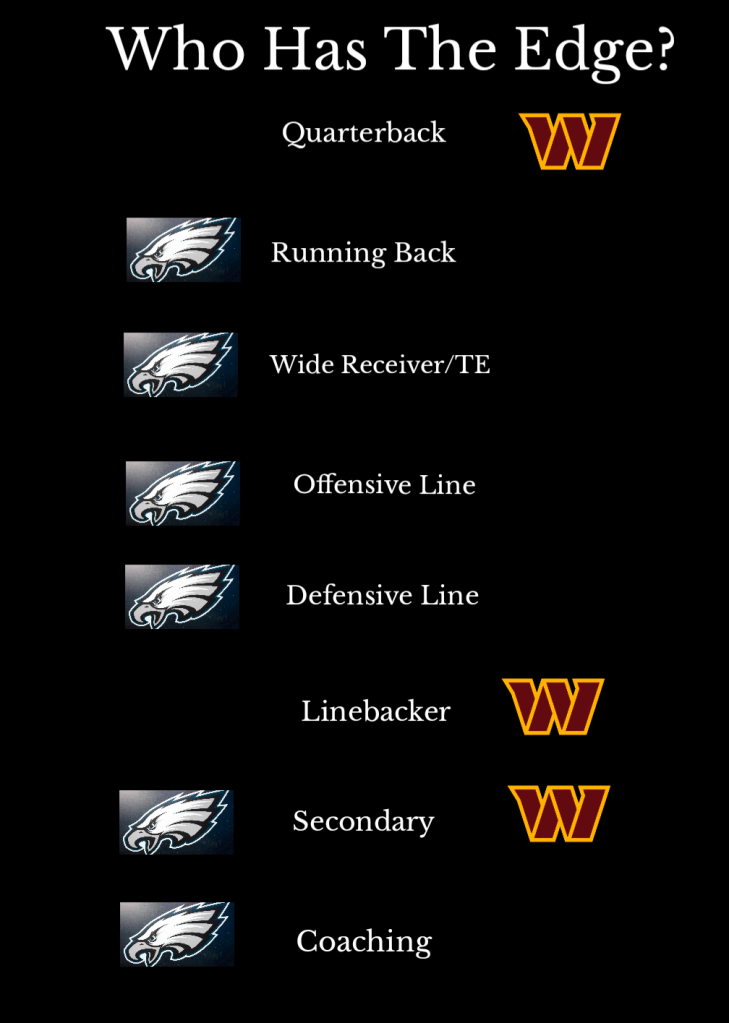A lot of thoughts are rushing through my mind heading into this matchup. The Eagles are just the better team, well, on paper. But this game is going to come down to defense. Can the Eagles stop rookie sensation Jayden Daniels? The last time the Eagles played him, Daniels scored three touchdowns in the fourth quarter en route to a comeback victory. He was one of the best QBs this season in the fourth quarter. He has become better and better each week. He hardly has made any mistakes in the last few weeks. He’s not to be taken lightly. The Eagles defense has a tough task, but they should get the job done, like they usually do.